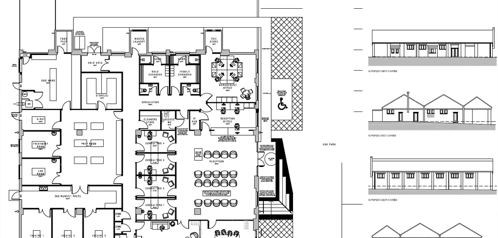 Facilities will include consulting rooms, theatres, a dog ward, cat ward, treatment rooms, MRI room , prep-room, x-ray room, CT scanner, offices, changing rooms and WC’s, waste and laundry room, staff areas, meeting room and waiting area.